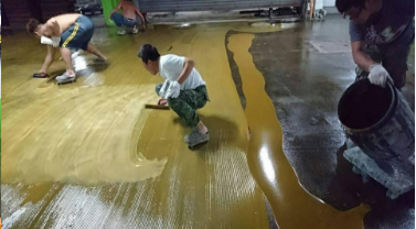 4、環(huán)氧膩?zhàn)樱簩h(huán)氧雙組份加入適量膩?zhàn)臃,用鏝刀將其均勻涂布一至兩道,增加地面的平整度;