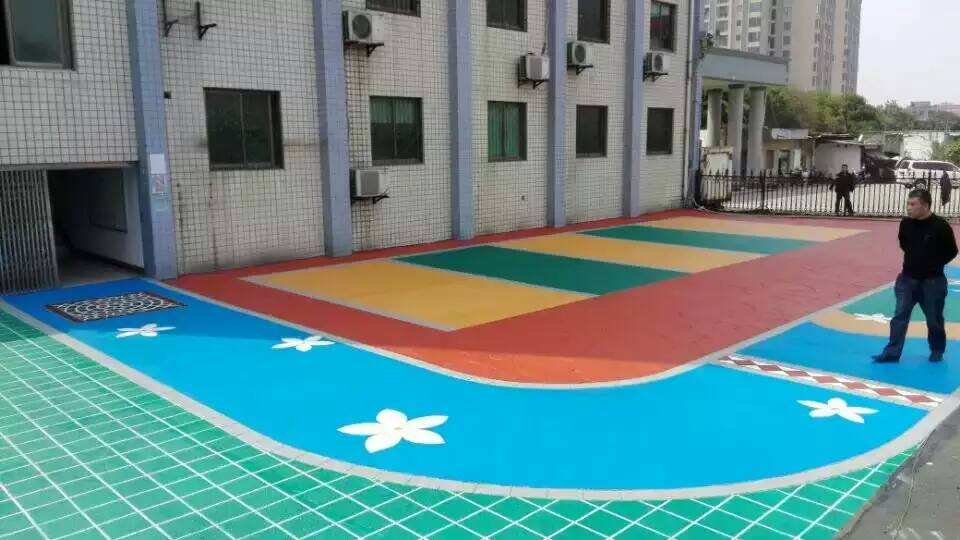 2.彩砂地坪施工方法:將材料按配合比充分攪拌,使用刮涂工藝反復刮涂。使環(huán)氧高滲透底漆封閉并滲透到混凝土基層,確保彩砂地坪與混凝土結合,提高附著力的持久性。