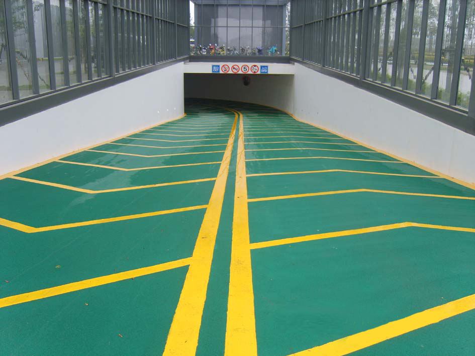 6、車輛出入口坡道防滑地坪車輛出入品必須具有防滑作用,有的停車場土建施工時已考慮到了,將之施工成波紋形不平的地面,這種情況下只需一部分涂車行通道顏色,一部分涂另一顏色,兩種顏色相間就可以了。如果土建時未設計考慮防滑要求,在地坪施工明此處應采用防滑地坪,而且防滑骨料顆徑應較大,通常直徑不低于2mm,視坡道傾斜度而選擇合適顆徑的防滑骨料。