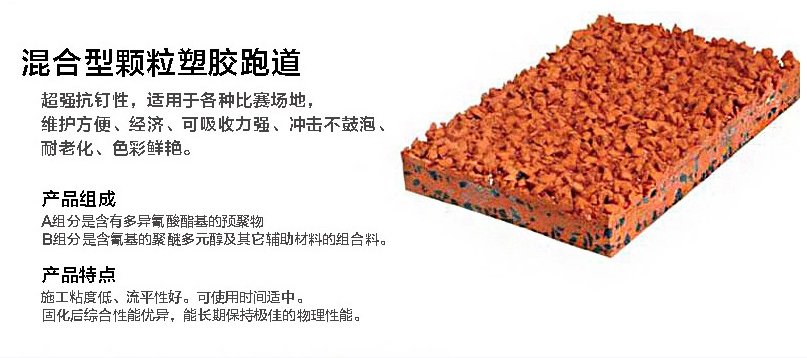 混合型塑膠跑道是由全PU摻雜部分橡膠顆粒為底層,聚氨酯顆粒與塑膠漿為面層鋪設組成的高性能塑膠結(jié)構(gòu)。它是國際田聯(lián)認可的運動場地?扇旌蚴褂,雨后能立即使用,具有彈性好、耐磨、耐高低溫、沖擊吸收性好等特點,實用性強,日常維護簡單易行。混合型塑膠跑道價格適中,適合各級標準比賽、訓練體育運動館、各大群體活動運動場。